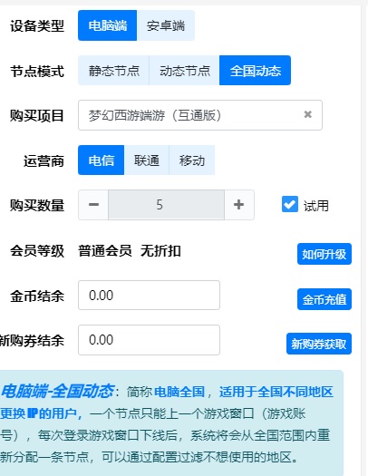 然后在弹出的页面上,选择设备类型 -节点模式-购买项目 -运营商 -购买数量,点中试用选项,然后点右下角的购买并支付