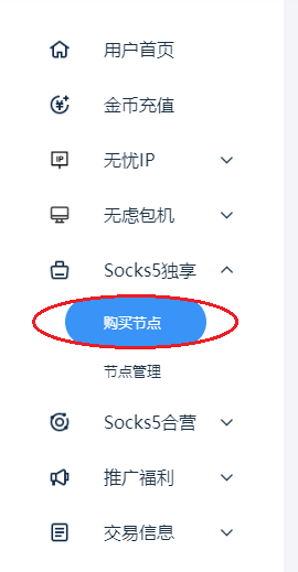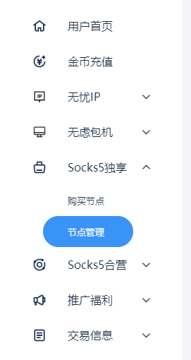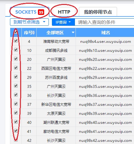 三.点击节点管理选择您购买的SK5 还是 HTTP ,然后选择购买的节点.
