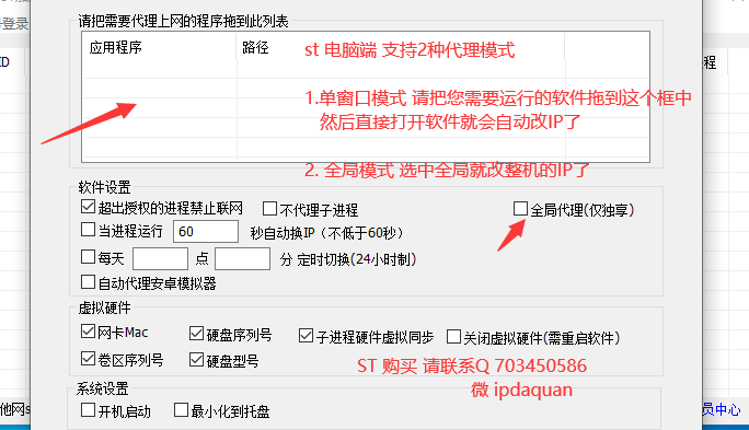 第一种是指定软件的模式,点软件上方软件设置, 代理设置 在弹出的框中 把您要运行的软件 游戏 拖到空白处就可以了.