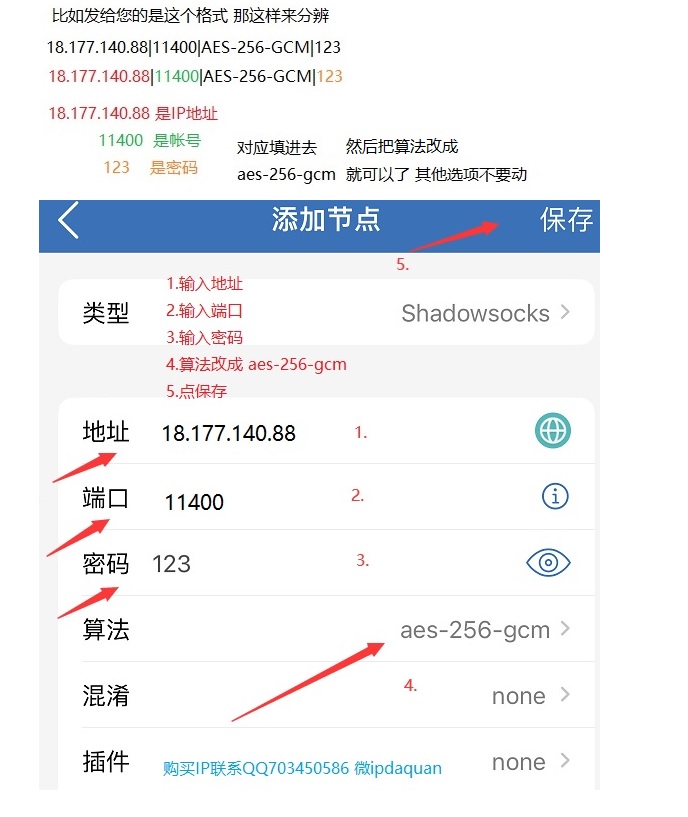 照上面的例子来分辨 服务器IP 18.177.140.88 端口 11400 AES-256-GCM是加密模式 密码是123